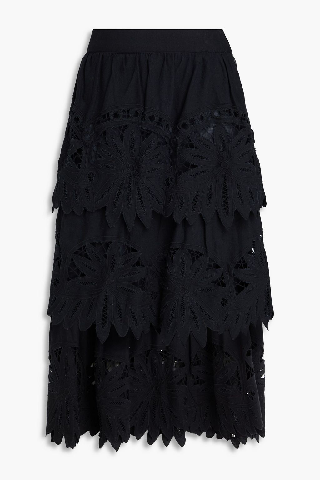 FARM RIO Tiered cotton and linen-blend guipure lace midi skirt