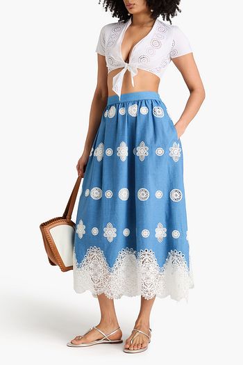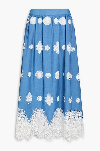 Rhea crochet-trimmed chambray midi skirt