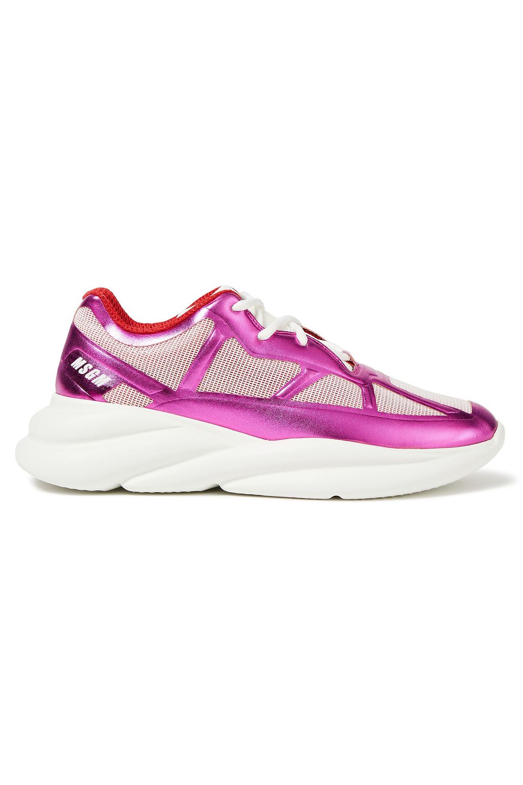 Metallic faux leather and mesh exaggerated-sole sneakers