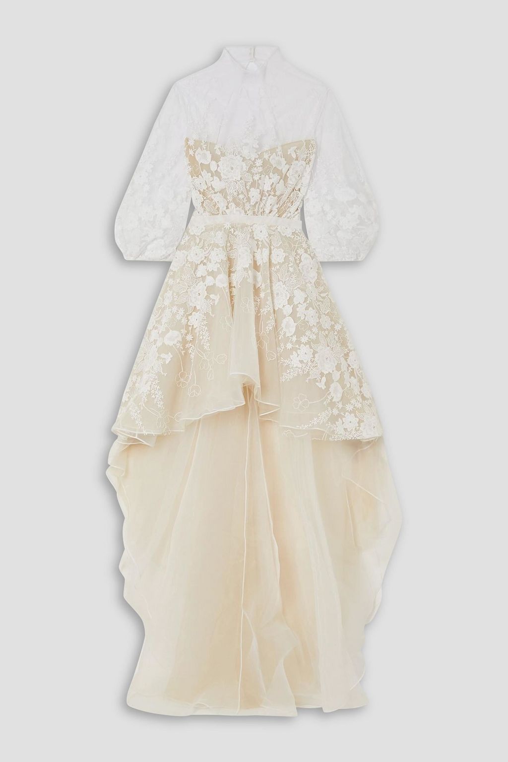 You know we’re big fans of Rime Arodaky, so naturally we’re swooning over this ‘Shiloh’ dress. It has a beautiful (and unique) high-low profile and open back. It’s made from layers of organza overlaid with tulle that’s embroidered with the most stunning blooms.