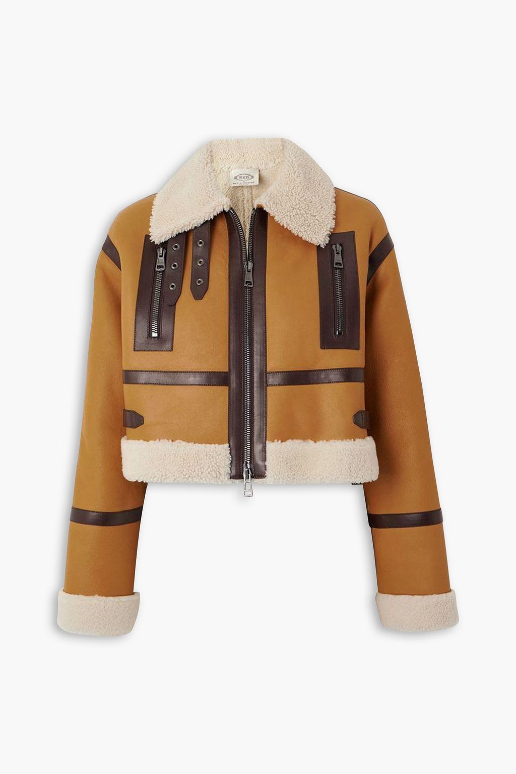 Tod’s aviator jacket comes in an exclusive, earthy color palette which makes styling so easy. It’s cut from soft shearling for a cropped, boxy fit, enhanced by dropped shoulders. The leather trims and buckles add to the utilitarian look.