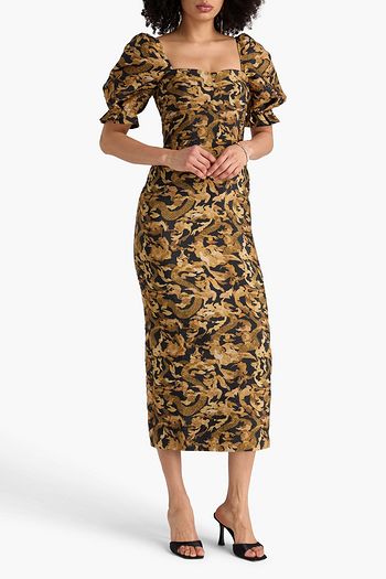 Ruffled metallic floral-jacquard midi dress