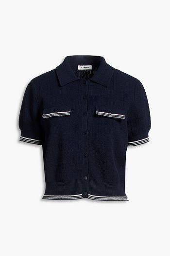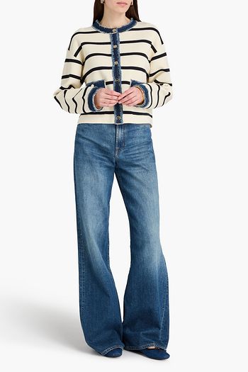 Denim-trimmed bouclé-knit cotton-blend cardigan