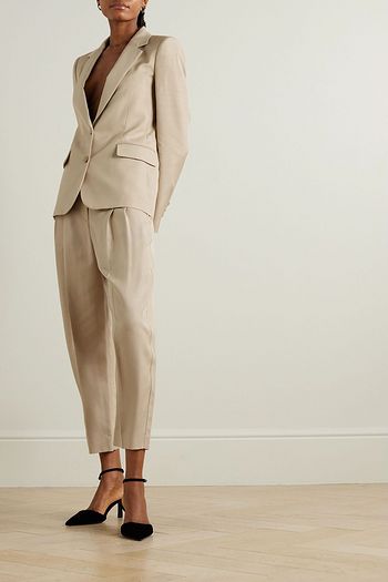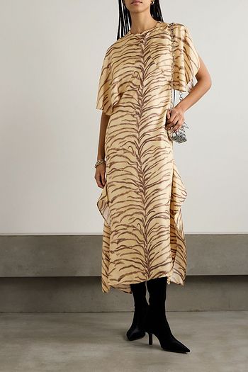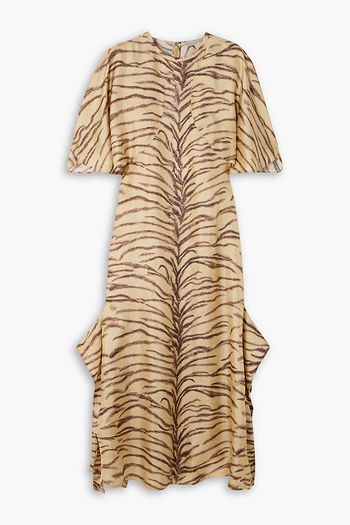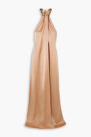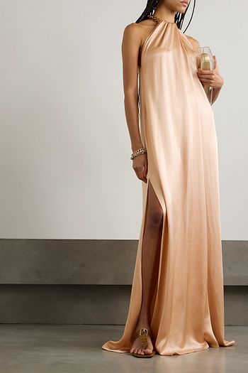 Asymmetric cutout lace-trimmed silk-satin midi dress