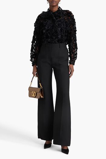 Crystal-embellished mesh-trimmed wool-twill straight-leg pants