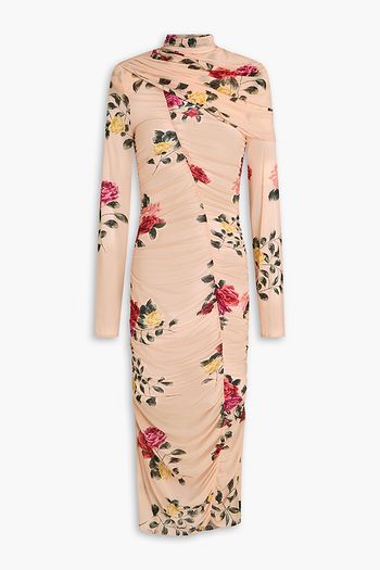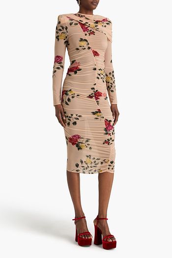 Ruched floral-print stretch-mesh dress