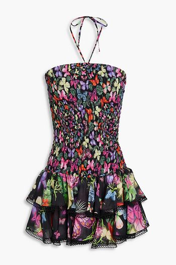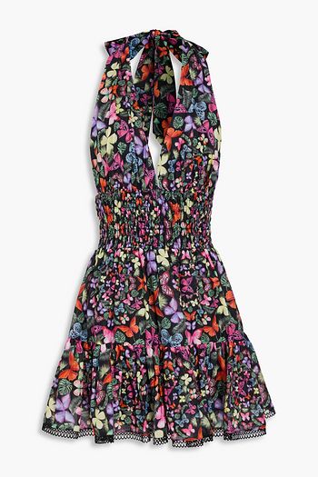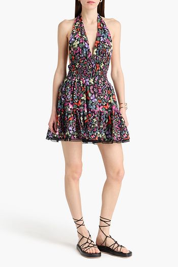 Shirred printed cotton-blend halterneck mini dress