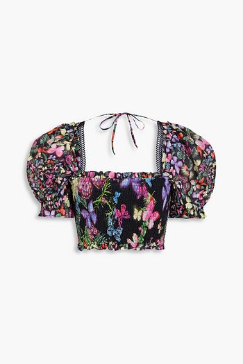 Lirio cropped shirred printed cotton-blend top