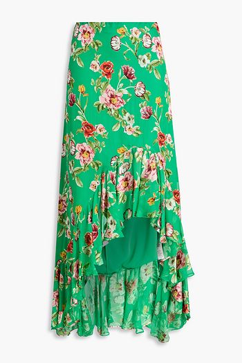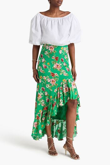 Asymmetric ruffled floral-print crepon skirt