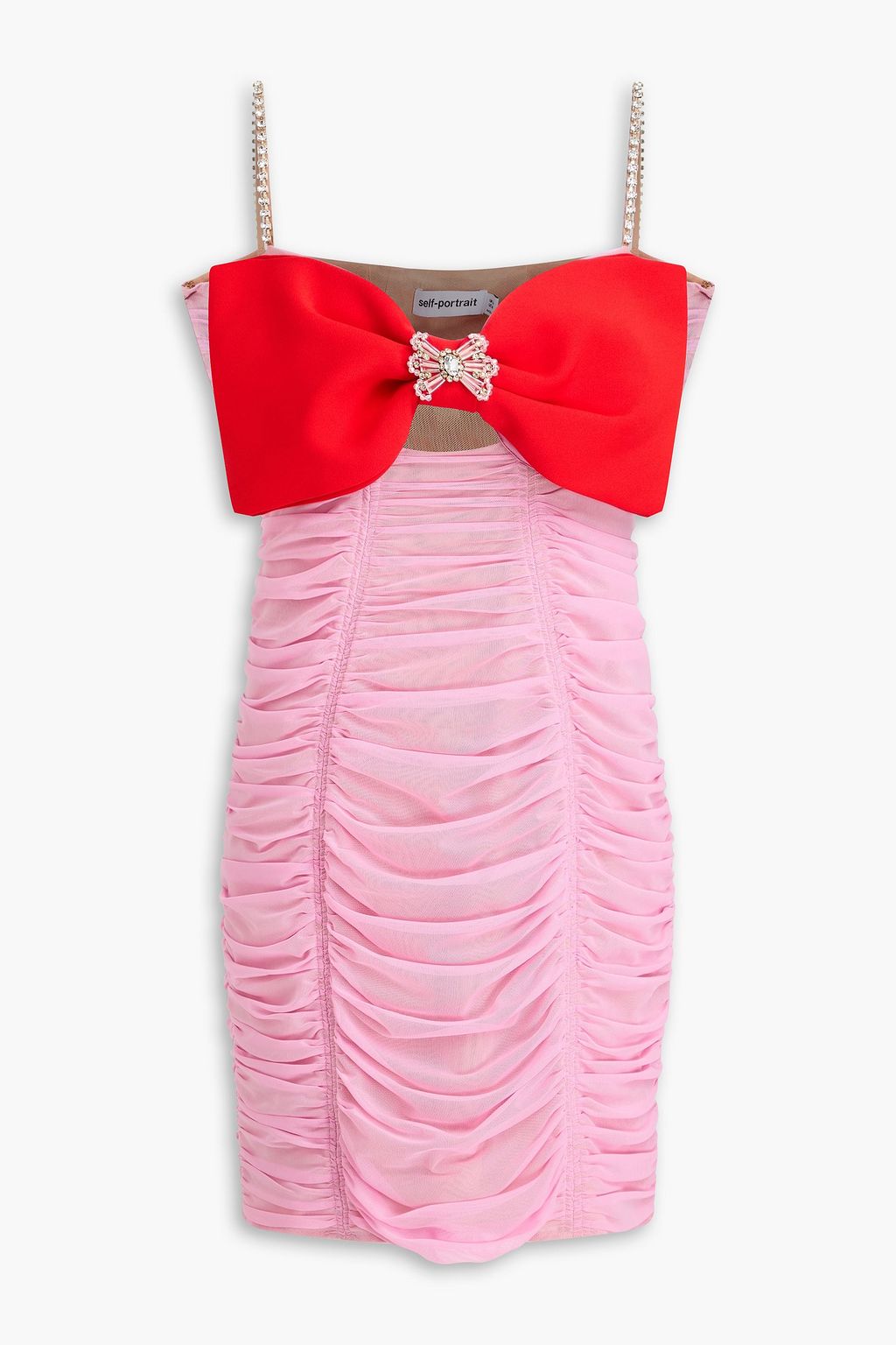 SELF-PORTRAIT Bow-detailed ruched mesh mini dress