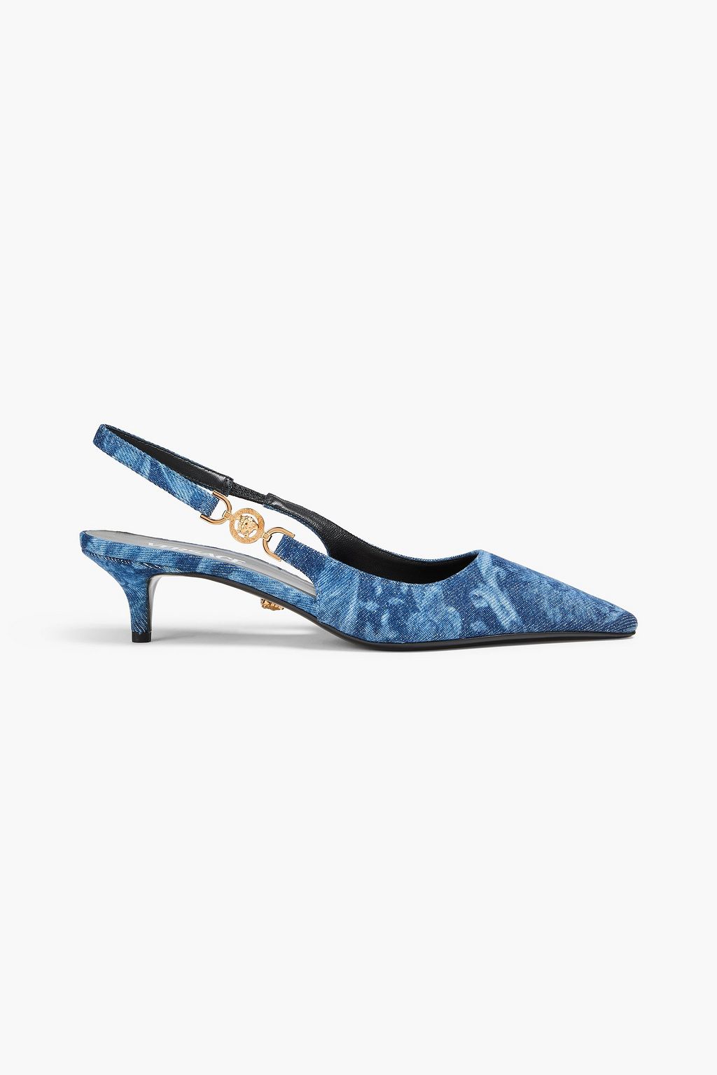 VERSACE Medusa embellished printed denim slingback pumps