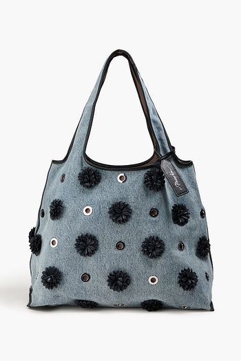 Embellished leather-trimmed denim tote