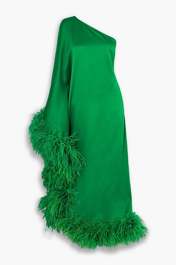 Ubud one-shoulder feather-trimmed satin-crepe maxi dress