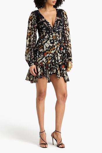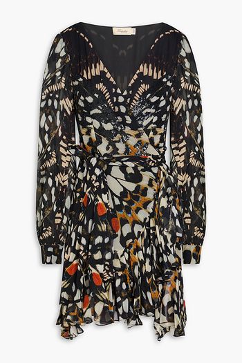 Silvana printed metallic fil coupé silk-blend chiffon mini wrap dress