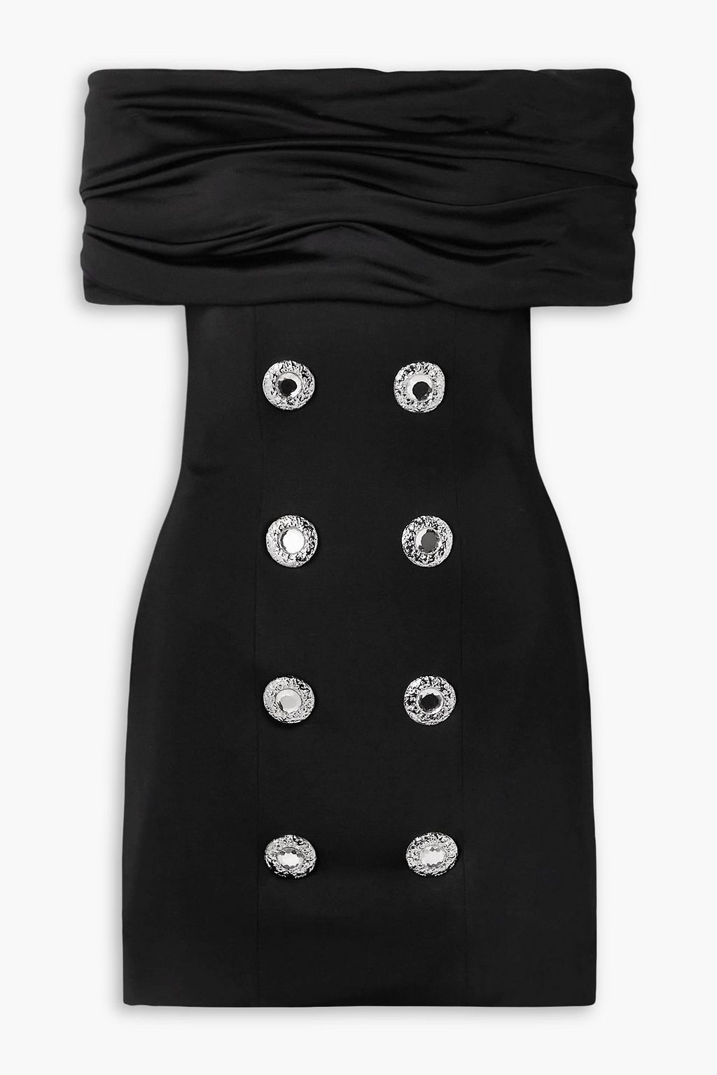 Balmain's little black dress is decorated with two rows of ornate button embellishments. It's cut from thick cady and has a sweeping off-the-shoulder neckline that's made from gently ruched jersey. The structured tulle lining supports the shape, while internal gumming ensures it stays in place.