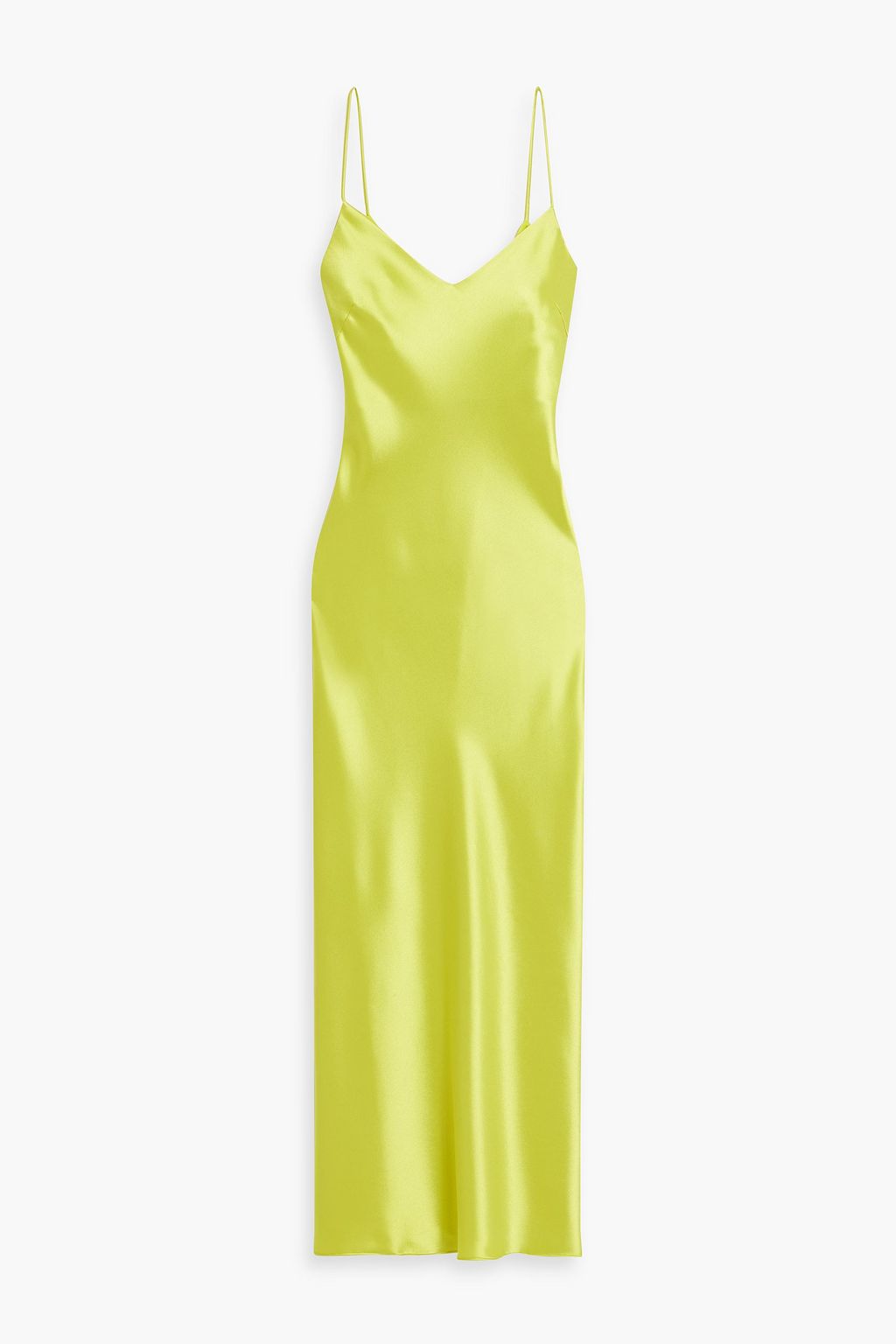 Add a pop of color to your occasion wardrobe with this slinky slip dress from Galvan London. Cut from lustrous satin, it skims the figure before falling to an ankle-grazing hem and features a V-neckline perfect for showcasing a favorite necklace or a few. The lime-green hue is unmissable in a crowded room.