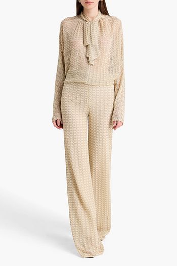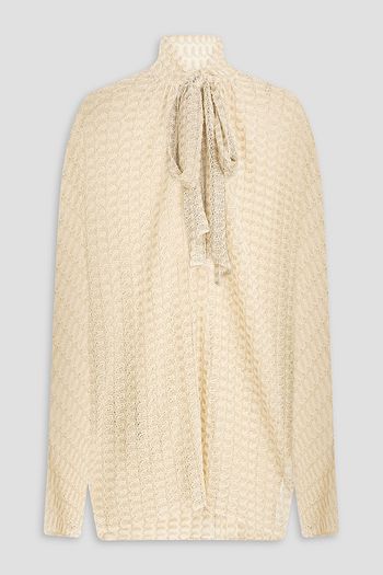 Pussy-bow metallic crochet-knit top