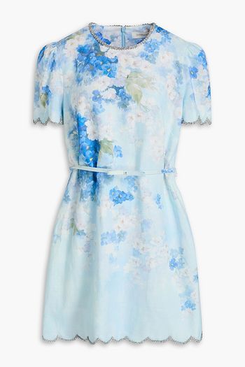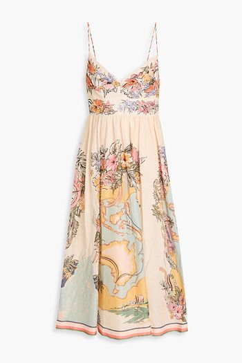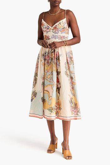 Pleated floral-print linen midi dress