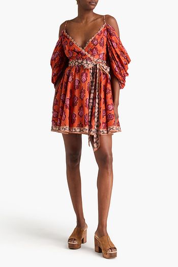 Cold-shoulder printed cotton-gauze mini wrap dress