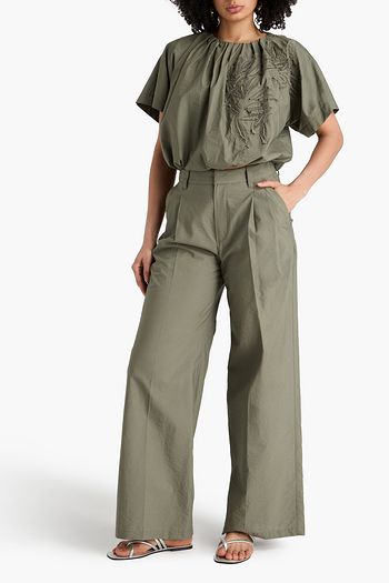 Pleated embellished cotton-twill wide-leg pants