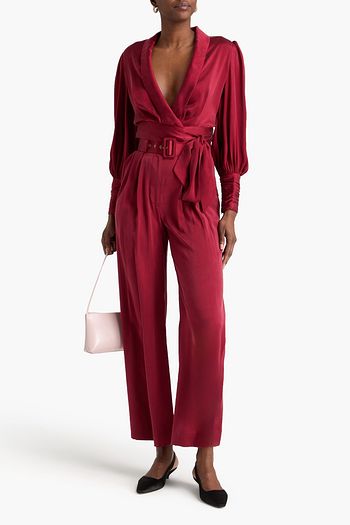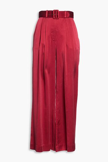 Belted pleated satin wide-leg pants