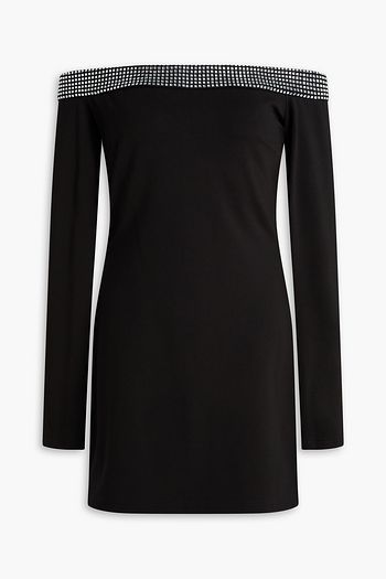 Carmella off-the-shoulder crystal-embellished satin-twill mini dress