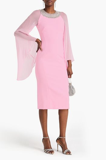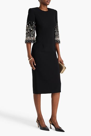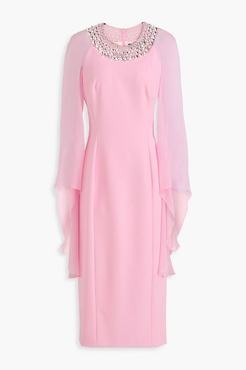 Off-the-shoulder belted velvet-trimmed grain de poudre wool-blend midi dress