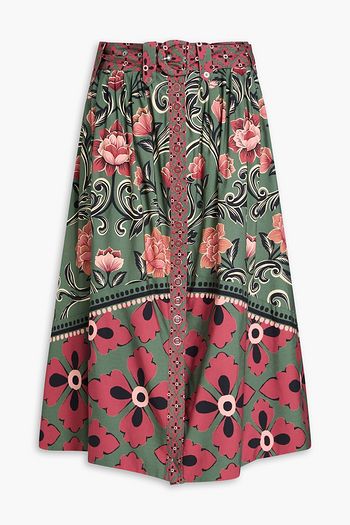 Pleated floral-print cotton-blend faille midi skirt