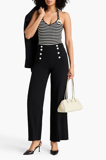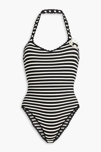 Floral-appliquéd striped ribbed-knit halterneck bodysuit