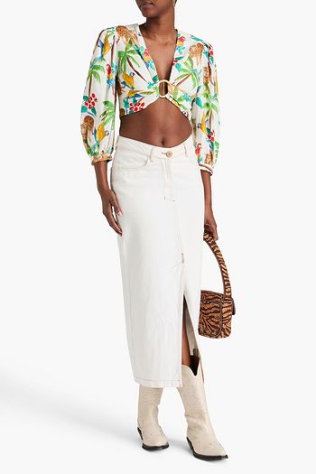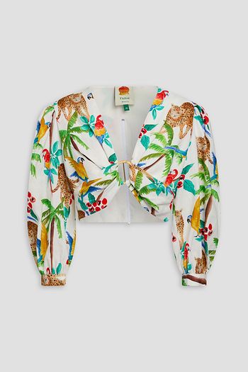 Cropped ring-embellished printed linen-blend top