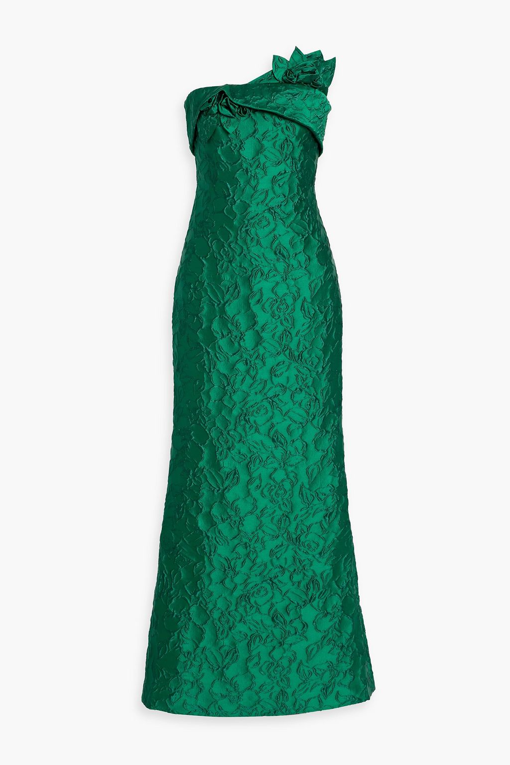 BADGLEY MISCHKA Strapless floral-appliquéd jacquard gown