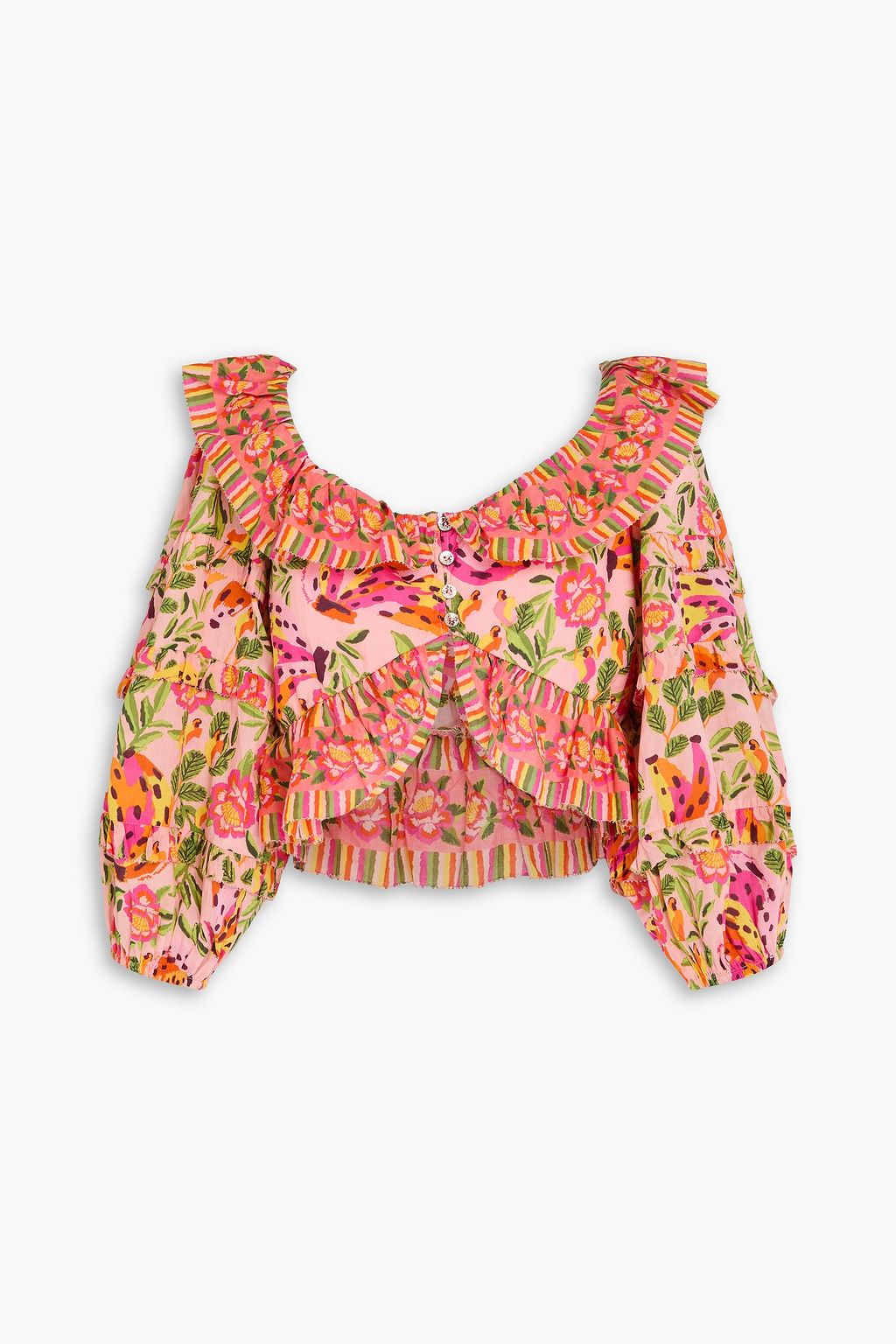 FARM RIO Cropped ruffled floral-print cotton-mousseline top