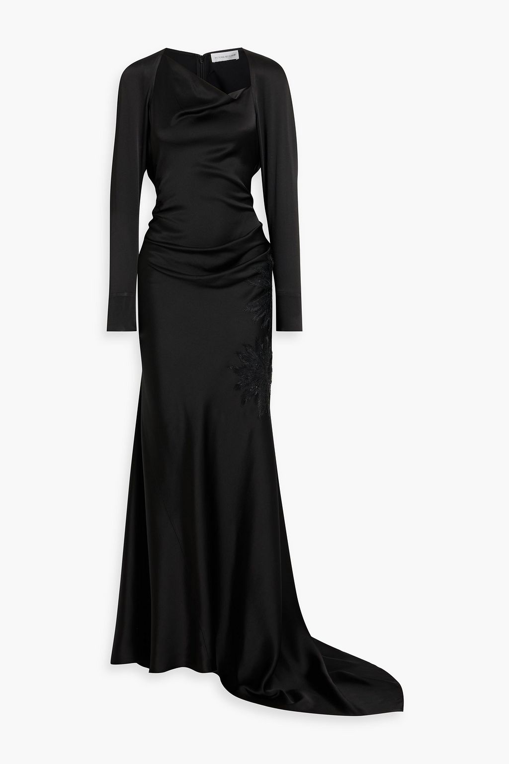 Need something for that black tie event? This Victoria Beckahm satin gown is adorned with delicate embroidery, a liquid-like drape and a sweeping train hem for a show‑stopping entrance. Style it with diamonds and the spotlight will be on you.