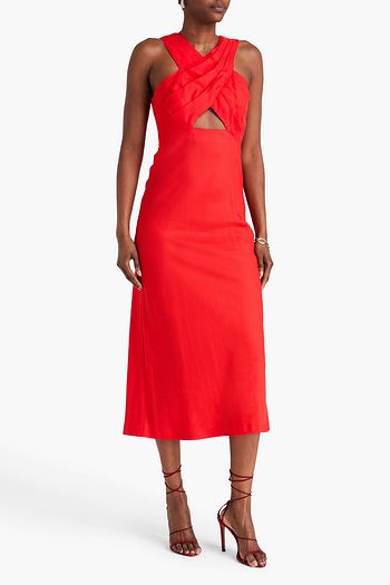 Plissé-georgette and linen-blend twill midi dress