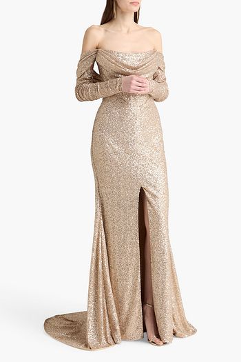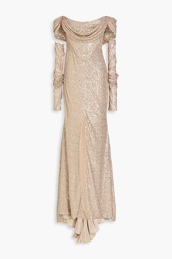 Off-the-shoulder draped sequined mesh gown