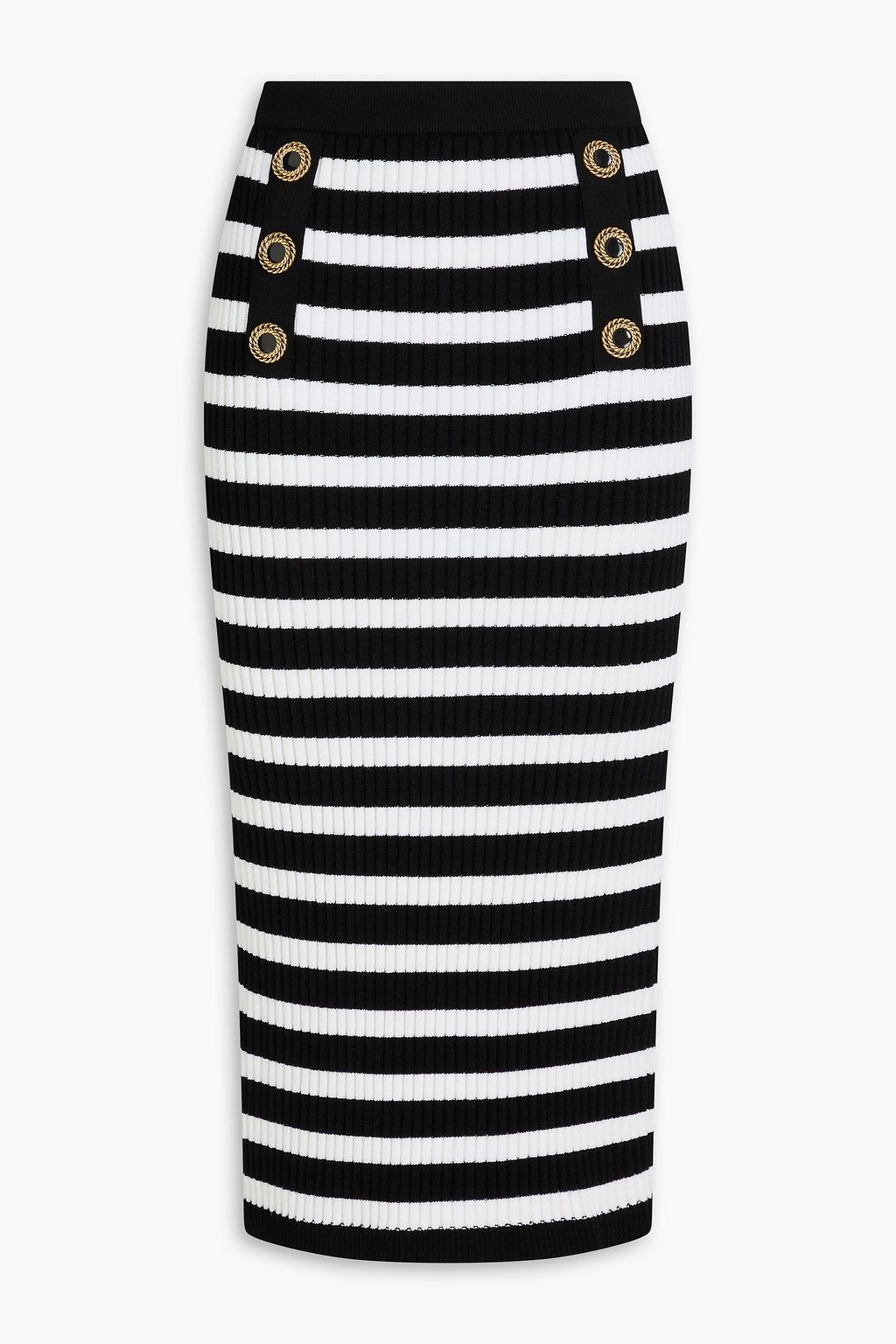 BALMAIN Embellished striped ribbed-knit midi pencil skirt