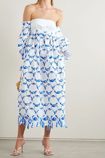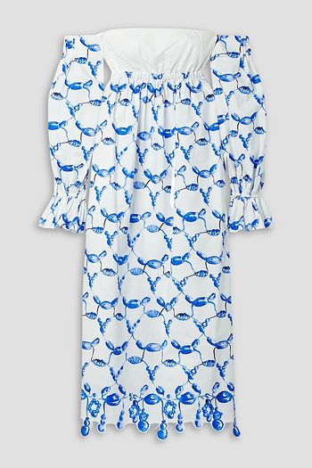 Off-the-shoulder scalloped printed cotton-poplin midi dress