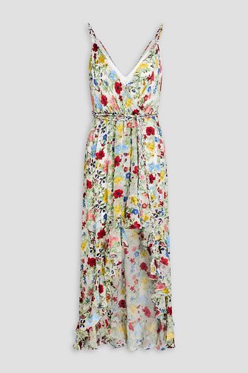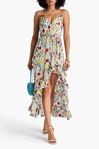 Wrap-effect ruffled floral-print burnout satin maxi dress