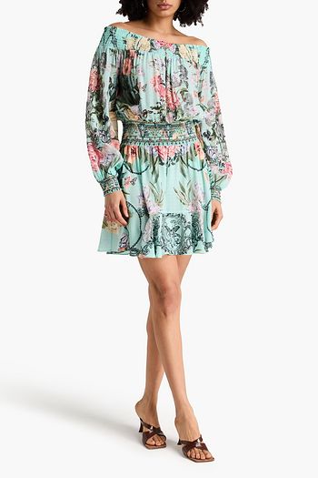 Off-the-shoulder floral-print silk crepe de chine mini dress