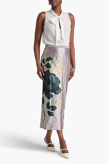 Floral-print crinkled-satin midi skirt