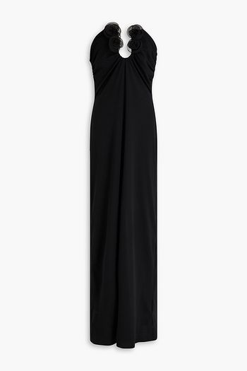 Ruched floral-appliquéd jersey halterneck maxi dress