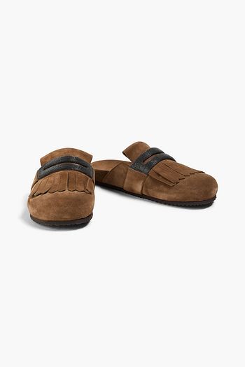 Bead-embellished suede slippers