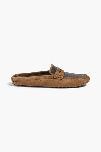 Tasseled crochet-trimmed suede loafers