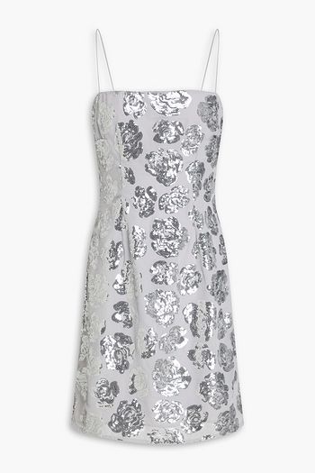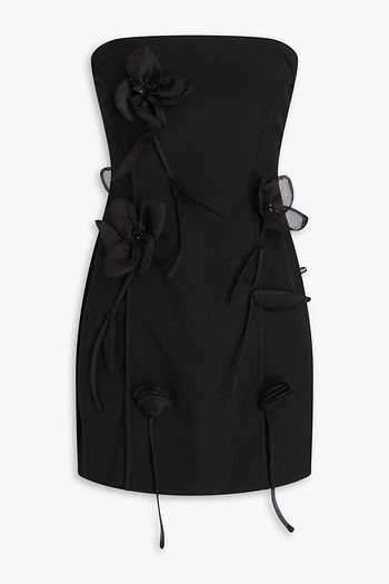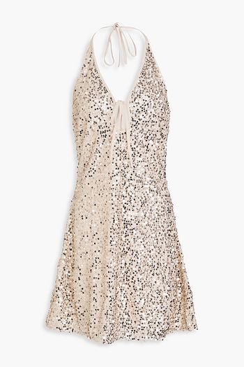 Off-the-shoulder appliquéd draped sequined crepe mini dress