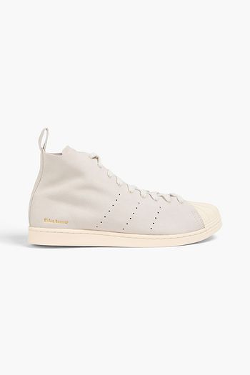 Fringed leather-trimmed mesh high-top sneakers