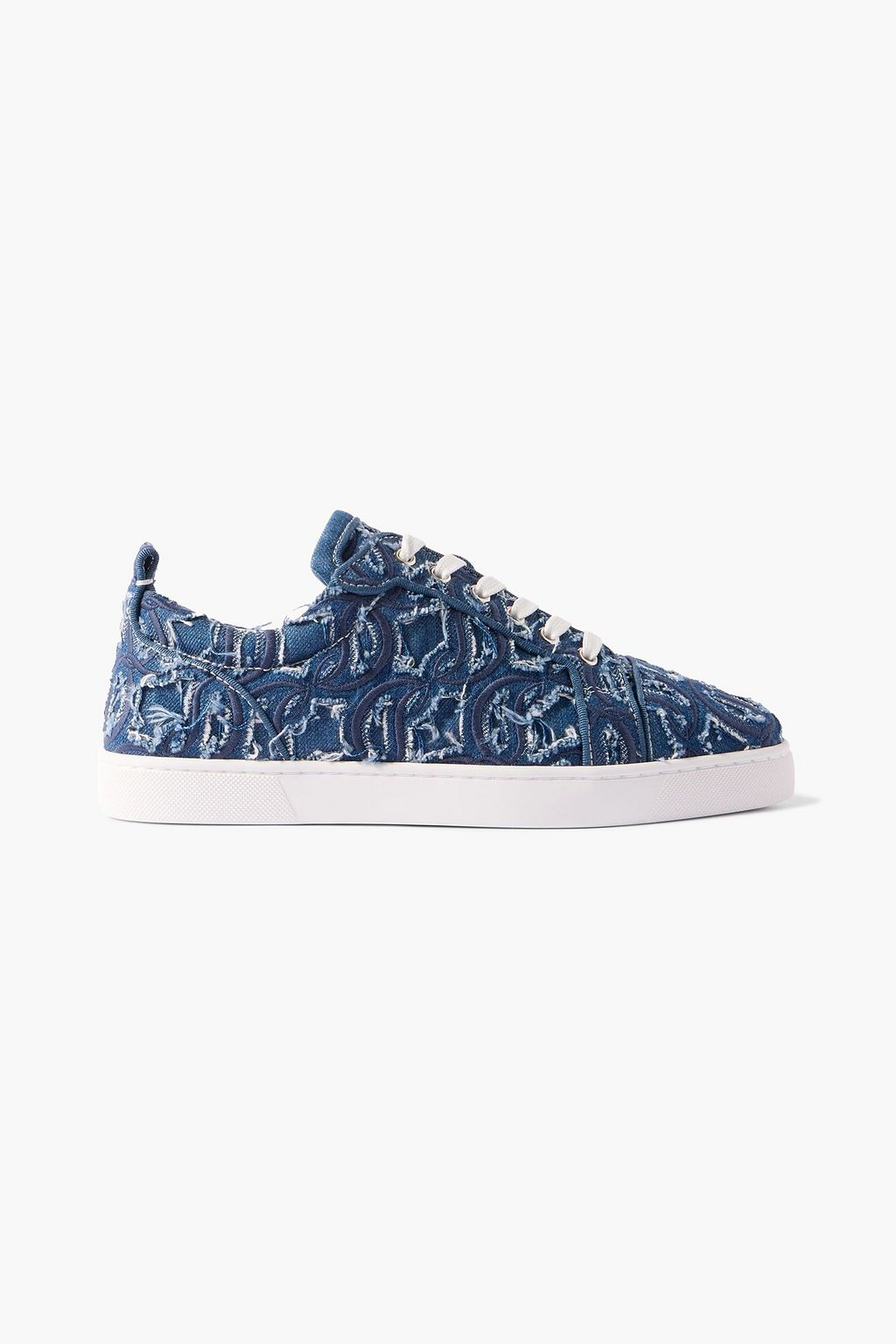 CHRISTIAN LOUBOUTIN Louis Junior grosgrain-trimmed embroidered distressed denim sneakers