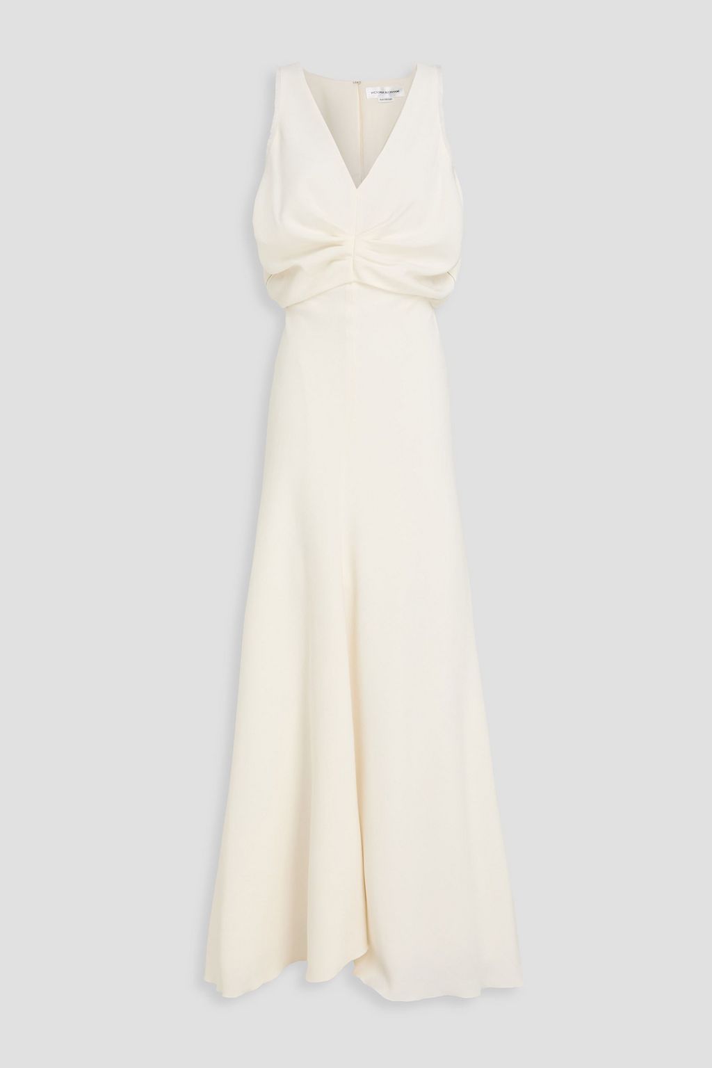 Go for bold with this Victoria Beckham ivory crepe gown. It presents draped tailoring and frayed hems that trail elegantly, creating an attention-grabbing silhouette. Reserve it for milestone celebrations and finish the look with drop earrings and sky-high heels.