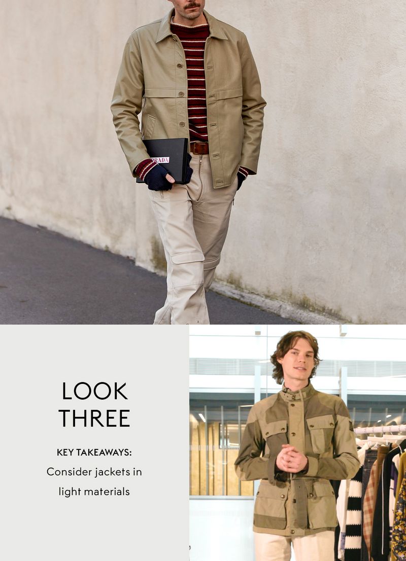 “This look is a bit smarter. We have a Belstaff Trialmaster jacket; this one is a bit more relaxed, in a cotton fabric rather than a waxy or leather finish. Moving down, we have a pair of James Perse trousers in an almost Hessian material. They’re light, flowy, airy and perfect for summer – you can dress them up or down accordingly. And onto shoes, I’ve chosen a pair of loafers – these ones are quite chunky, so it’s not as if they’re the super-smart ones you’d wear with a suit or a tux.”