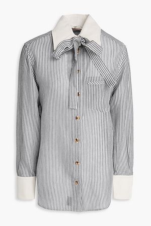 The brushstrokes might be yours: some chandelier earrings, a hot hue of lipstick or perhaps a brooch. (The latter approach was chosen by one of the earliest female white-shirt adopters, Katharine Hepburn in the 1938 film Holiday. Prior to that, no nice girls wore white blouses. Shirts were strictly for the boys.) Then again, the flourishes might be the shirt’s own: a ruffle, a flounce, a bow, embroidery, a bouffant shoulder or cuff; all of the above.