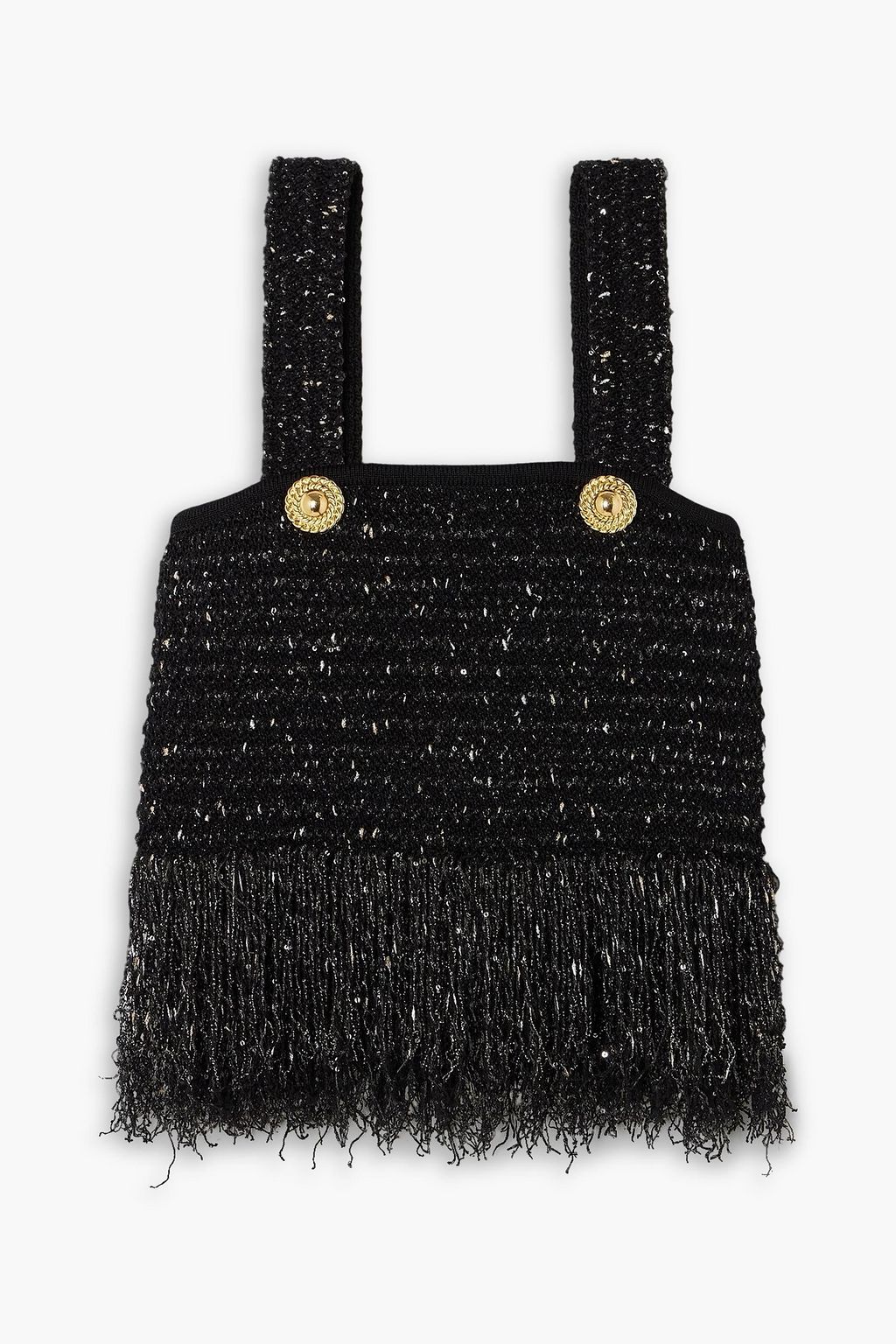 BALMAIN Fringed embellished metallic bouclé-tweed top
